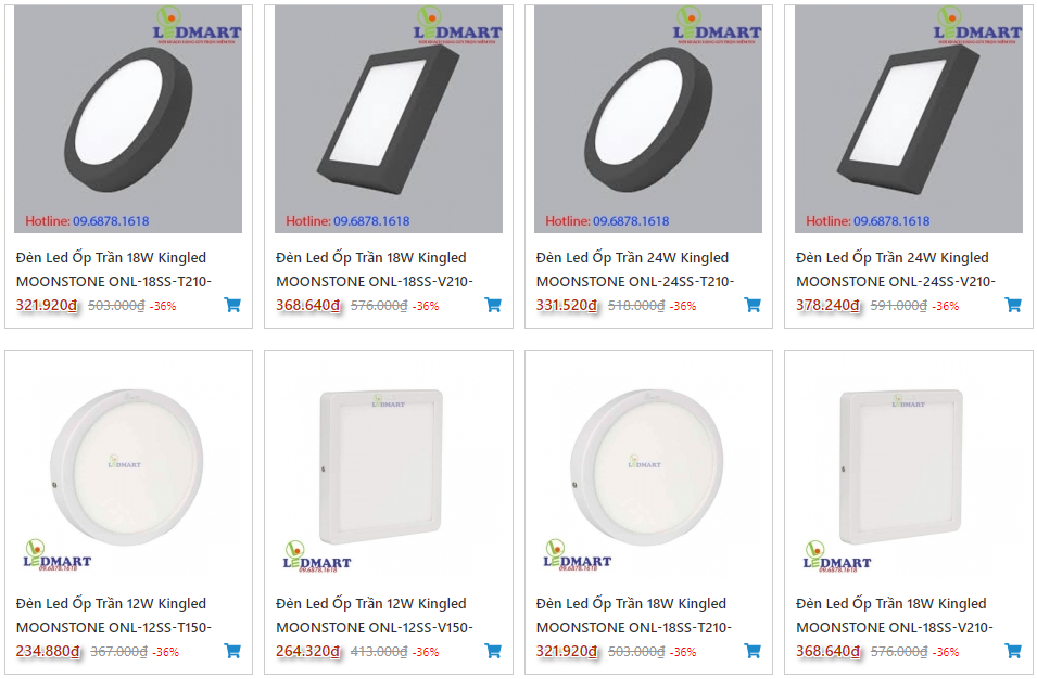| 8 | Đèn LED Ốp Trần 18W MOONSTONE KingLED ONL-18SS-T230-V/TT/T | 326.950 VNĐ |